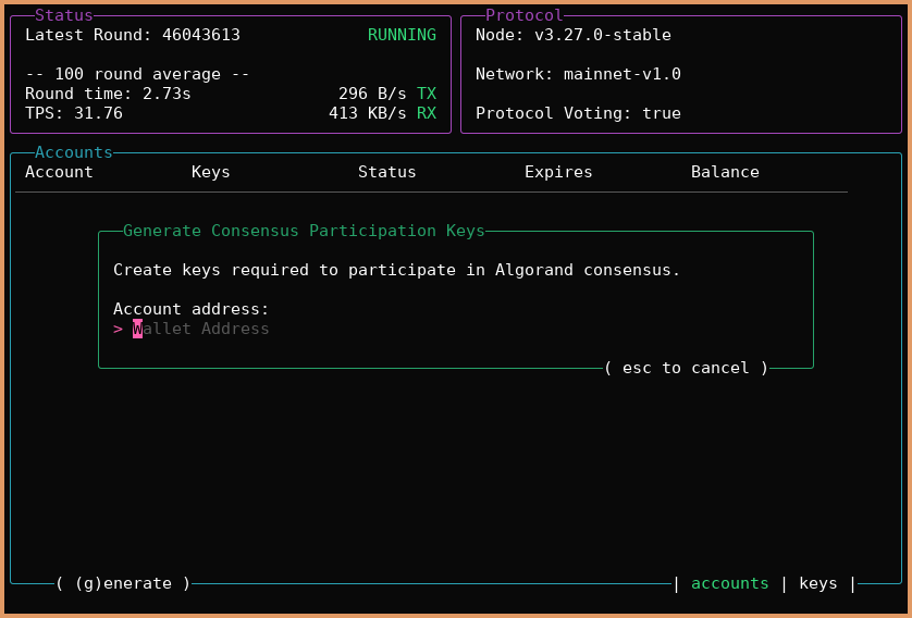 NodeKit will ask the account address that will be participating in consensus. Enter your account address and press ENTER.