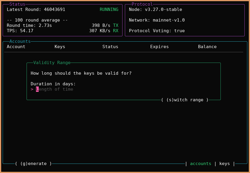 NodeKit will ask the number of days that the participation keys will be valid for: