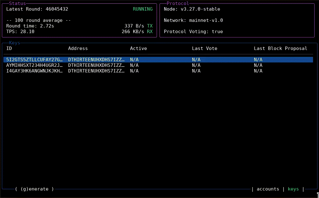 If you have participation keys for more than one account on your node, you can navigate between accounts using the up and down arrow keys.
